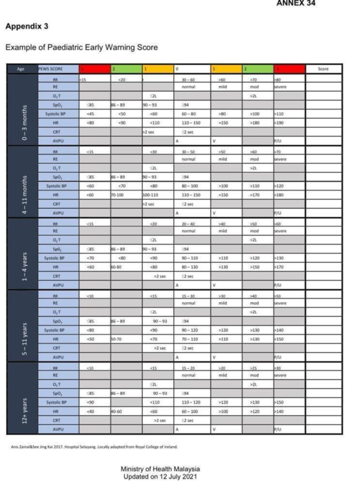 CalculatorPaediatric Early Warning Score (PEWS Score)Izuan14/04/2026 PEWS Calculator Age 4–11 months 1–4 years 5–11 years 12+ years Respiratory Rate Respiratory Effort Normal Mild Moderate Severe Heart Rate Systolic BP SpO₂ O₂ Therapy None ≤2L >2L CRT ≤2 sec >2 sec AVPU Alert Voice Pain/Unresp Calculate Score: – Source: